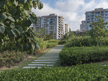 La disposición del parque está centrada en la ubicación estratégica de las canchas de tenis, las cuales están orientadas para maximizar su funcionalidad y accesibilidad. A su alrededor se distribuyen grandes áreas verdes dedicadas a actividades recreativas y de descanso. Un sendero peatonal central, rodeado de vegetación exuberante, conecta el parque con el barrio y, en el futuro, con el desarrollo comercial cercano, generando una vía de circulación fluida que invita a los transeúntes a disfrutar tanto del deporte como de la naturaleza.