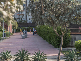La materialidad del parque se basa en el uso de tonos terracota y rojizos, inspirados en el “Polvo de Ladrillo” o arcilla de las canchas de tenis, lo que establece una coherencia visual con el entorno deportivo. Este color se extiende a lo largo del parque, creando un vínculo estético entre las canchas y las zonas verdes circundantes. Además, el diseño incluye una zona de servicios y equipamiento comunal, complementando las actividades deportivas y recreativas de la comunidad.
